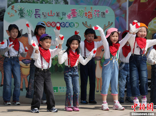 4月7日,台北市立动物园为台湾同胞回赠大陆同胞的长鬃山羊(“喜羊羊”和“乐羊羊”)和梅花鹿(“繁星”和“点点”)举行祈福活动,它们即将在16日启程赴山东刘公岛。这场名为“永保安康——为长鬃山羊与梅花鹿祈福”的活动吸引了近百名幼儿园小朋友和小学生参加。图为祈福仪式上,台北小朋友跳起自编自演的动物舞蹈。路梅 摄