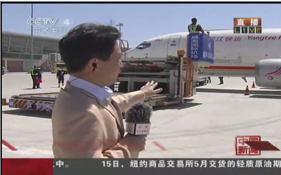 长鬃山羊“喜洋洋”、“乐洋洋”以及梅花鹿“繁星”和“点点”抵达机场后,被小心的运下飞机。图片来源:中央电视台