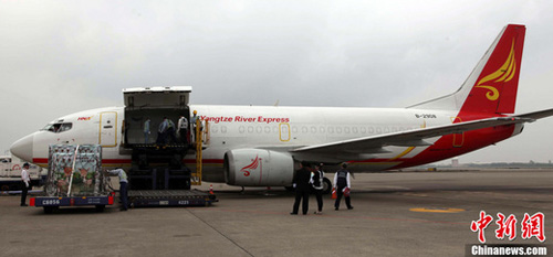 4月16日上午10点05分,运送台湾梅花鹿繁星、点点和长鬃山羊喜洋洋、乐洋洋的货机扬子江B-2908在台北桃园机场装机起飞。预计将于下午一点抵达山东威海安家定居,在山东经过一个月的隔离检疫期后,将和广大游客见面。中新社发 沈存旭 摄