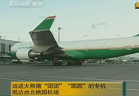 12月23日下午5时许,运送大熊猫“团团”“圆圆”的专机抵达台北桃园机场。(电视截图)