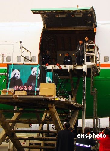 12月23日13时40分,在“家乡人”举行隆重的欢送仪式后,赠台大熊猫“团团”“圆圆”登上“熊猫专机”,台湾长荣航空公司波音七四七-四00客货机随后载着它们和赠台17棵珙桐树苗飞往宝岛台湾。 中新社发 霍潺 摄
