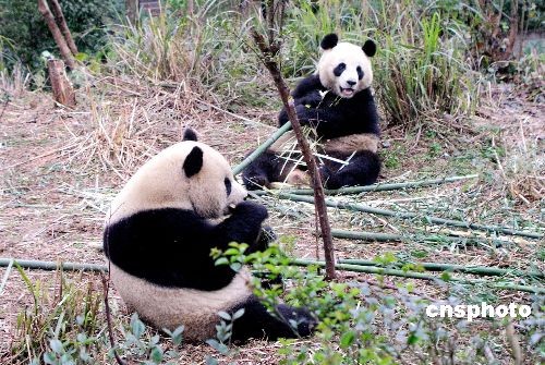 资料图片:12月22日,在四川省雅安市“中国保护大熊猫研究中心雅安碧峰峡基地”,“团团”、“圆圆”欢快度过在家乡最后一日。 中新社发 张国军 摄
