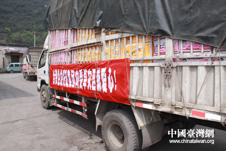 装载着旺旺集团捐赠饮料的车正向灾区开去。