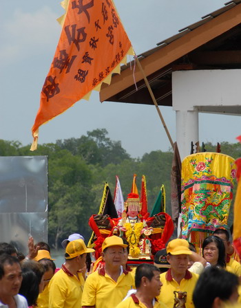4月27日, 在马来西亚雪兰莪州巴生港地区吉胆岛(又称蟹岛)一个华人渔村,村民抬着妈祖神龛结束海上巡游。
