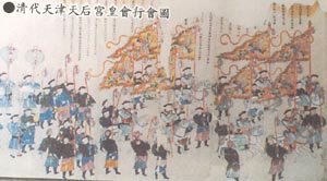 我们这里讲的皇会的銮驾,是一个大的概念,是依照敕封天后应有制度的一切仪仗执事。也就是说,除了标志着天后出巡使用的警戒执事外,还包括为其开道的各种仪仗组织。比如门幡、太狮、鲜花灯亭、华盖宝伞、宝鼎、宝塔等。