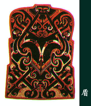 盾 是古代防御兵器。在战国时期楚墓中较常见。胎骨有木胎与皮胎二种,均髹漆,一般都有彩绘花纹。随州曾候乙墓出土盾49件,小平顶外凸,上部为双弧形,下部为长方形,正面呈凸弧形,背面正中安木盾柄。江陵望山1号墓出土12件,器形较小,大多有彩绘花纹。