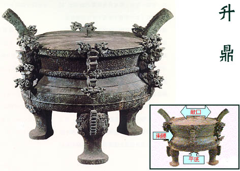 商朝以来传统鼎的形制中,只有方鼎为平底,如商代著名的司母戊大方鼎。圆鼎的器身一般采用与缶、罐、盂等器相类似的圈底。而圆形的升鼎却空前地在以优美柔和的圆弧线为主构成的器形中,引人了方硬而富有力度的水平横线。腹底由圆而变平,方折的口沿、底沿和耳沿,与外撇耳、蹄形足和内收的鼎腹等部位的圆弧线形成对比,刚柔相济,使得鼎的造型赋于节奏和韵律。