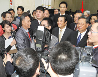5月5日一下飞机,黄小晶(箭头指处)对台湾民情立刻有了“初体验”,媒体蜂拥相迎,黄小晶立即随问随答,像是有备而来。