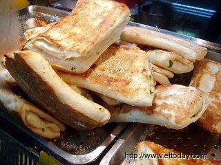 这种外酥内软的“厚饼”就是我们要好好介绍一下的“葱花长饼”。只不过,他们在放入烤炉之前,来刷上一层薄薄的糖蜜,吃起来外酥内香,还带点甜味。建议,夹入葱蛋吃更棒!口感奢侈,却可以让你内心有种满满的幸福。