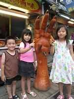 高雄市“正义夜市”路旁的福州熏茶卤味摊前,有一支重达20公斤、高140公分的超大支模型鸡脚,虽然只能看不能吃,却为摊商带来不少生意。