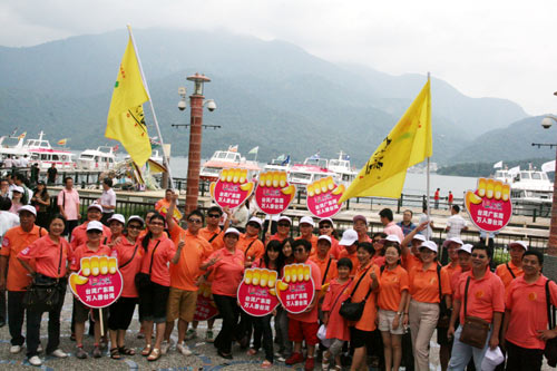 广东省长黄华华所率领的广东省经贸文化交流团,19日抵日月潭游湖,随行还有广东旅游团游客,他们高举“台湾广东周、万人游台湾”招牌在水社码头合影。图片来源:“中央社”