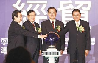辽台经贸论坛昨在君悦饭店举行,陈政高(左二)、邴志刚(左一)、连战(右二)、江丙坤(右一)共同主持开幕。记者陈柏亨/摄影(台《联合报》)