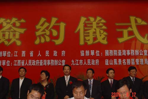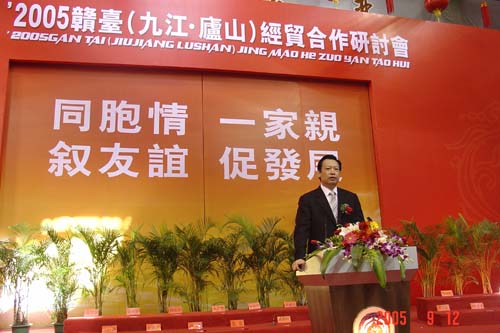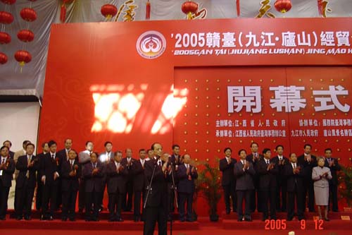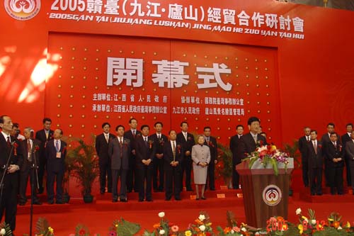 金秋匡庐迎盛事,赣台友情促共赢。9月12日上午,庐山旅游会议中心被欢庆的气氛包围,彩旗在青山掩映中飘扬,鼓乐在环山拥抱中回响。9时20分许,随着中共中央政治局委员、国务院副总理吴仪将一把金色的钥匙插入启动台,象征赣台友谊与合作的红色大门徐徐推开,“同胞情、一家亲、叙友谊、促发展”十二个鲜亮的大字呈现于2100余名与会者眼前。2005年赣台经贸合作研讨会宣布正式开幕。