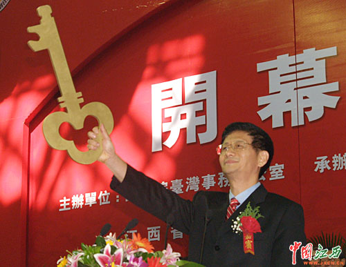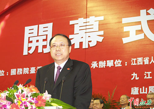 中共江西省委书记孟建柱在’2006赣台(九江·庐山)经贸合作研讨会开幕式上致欢迎辞,并开启“赣台合作”大门。(杨冗晟 摄)