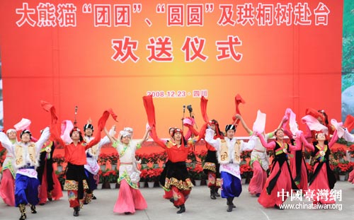 12月23日,成都双流机场为赠台大熊猫和珙桐树苗举行欢送仪式,这是欢送仪式开始前现场表演少数民族歌舞。中国台湾网 田云鹏 摄