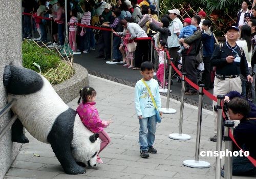 二月十四日,大陆赠台大熊猫“团团”和“圆圆”首次在台北新家的户外展示场与游客见面,再度掀起台湾民众的参观热潮。图为排队等待参观的小朋友忍不住先与大熊猫塑像合影“过把瘾”。 中新社发 路梅 摄
