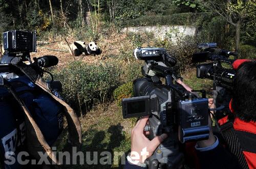 12月11日,媒体记者在拍摄大熊猫“团团”“圆圆”。 当日,来自海峡两岸数十家媒体的记者来到中国保护大熊猫研究中心雅安碧峰峡基地,关注即将赴台的大熊猫“团团”“圆圆”,了解它们的近况。目前,大熊猫“团团”“圆圆”的体重已分别达到112公斤和114公斤,两只大熊猫每天要吃50公斤竹子。 新华社记者陈燮摄