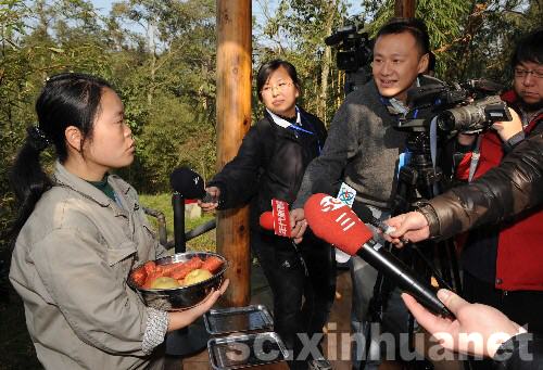 12月11日,台湾媒体记者在采访大熊猫“团团”“圆圆”的饲养员。 当日,来自海峡两岸数十家媒体的记者来到中国保护大熊猫研究中心雅安碧峰峡基地,关注即将赴台的大熊猫“团团”“圆圆”,了解它们的近况。目前,大熊猫“团团”“圆圆”的体重已分别达到112公斤和114公斤,两只大熊猫每天要吃50公斤竹子。 新华社记者陈燮摄