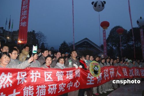 12月23日,大熊猫研究中心工作人员欢送“团团”“圆圆”离开雅安碧峰峡前往成都双流国际机场。台湾人民期盼已久的“团团”、“圆圆”,终于踏上了赴“宝岛”台湾之路。 中新社发 欧颖 摄