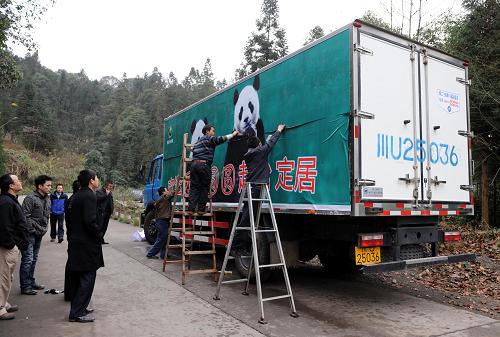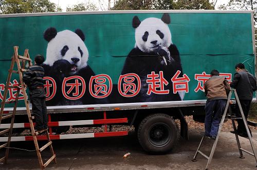 12月21日,工作人员在装饰运送“团团”“圆圆”的卡车。当日,运送赠台大熊猫“团团”“圆圆”从雅安到成都双流机场的工具准备就绪,卡车和铁笼均用“团团”“圆圆”的照片装饰起来。新华社记者 陈燮 摄