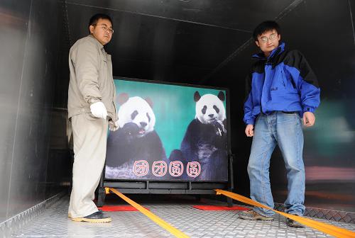 12月21日,工作人员在装饰运送“团团”“圆圆”的卡车。新华社记者 陈燮 摄