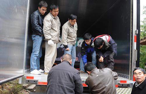 12月21日,工作人员在处理运送“团团”“圆圆”的卡车。新华社记者 陈燮 摄