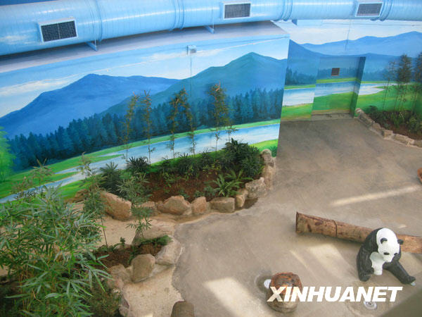 室内展示场共有两个房间,面积分别是254平方米和210平方米。屋内植被葱茏、流水潺潺,墙面彩绘“团团”“圆圆”故乡地貌:雪山耸立、森林茂密、江河奔流,每个细节都似乎要慰藉它们的思乡之苦。