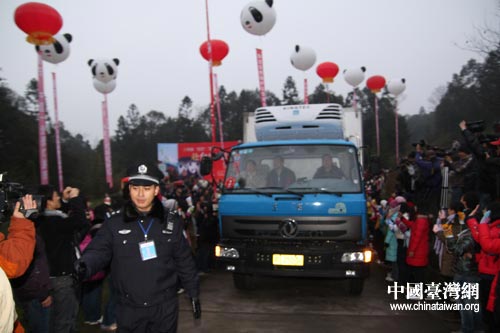 12月23日,四川雅安碧峰峡基地举行大熊猫赴台启动仪式。运载“团团”、“圆圆”的运输车从碧峰峡基地启程驶往成都双流机场。中国台湾网 田云鹏 摄