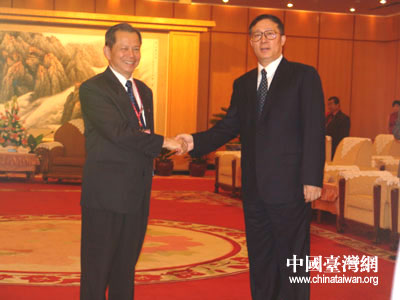 图:中共深圳市委书记李鸿忠(右)与中国国民党台南市党部主任委员庄松旺(左)握手