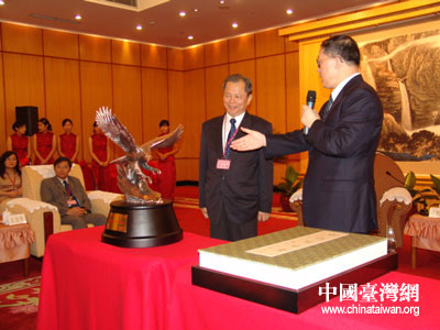 图:中共深圳市委向中国国民党台南市参访团赠送了一只“大鹏展翅”雕塑和一本“论语百家书”