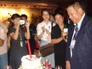 昨天晚上,正当所有记者们还在按部就班、忙碌地采访宁波市委为基隆访问团举行的中秋酒会之际,宁波市负责接待的工作人员忽然宣布,请所有来宾注意,今天正好是基隆访问团一位成员的生日,5分钟后,台办将为其送上生日蛋糕,表达祝福。这一下调动了记者们的敏感神经,大家都在争抢第一手资料,争睹寿星宁波过生日的情景。