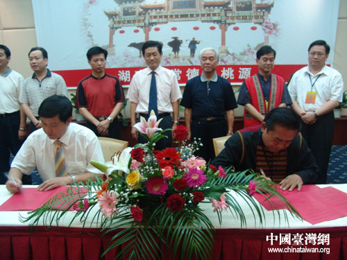 中国台湾网8月8日湖南消息 参加第六届湖湘文化之旅交流活动的台湾中、小学校长参访团,昨天与湖南省桃源县中小学进行交流,并签署了《教育合作交流意向书》,台湾“桃园”县与湖南“桃源”县中小学校也因此缔结为长期友好合作关系。