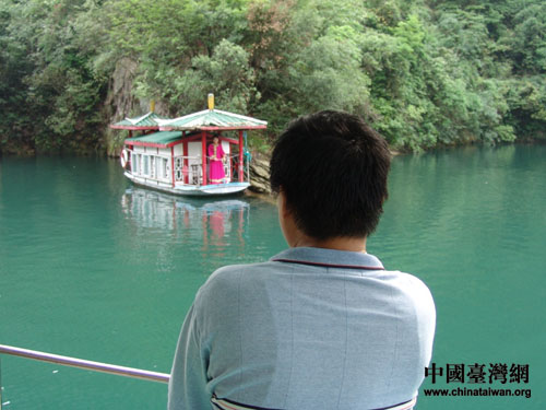 游船划出碧波,载着台湾客人环湖一周,领略“孔雀开屏”、“金龟出水”、“仙女照镜”等神奇自然景观,微风徐来,心旷神怡,确似身在瑶池。