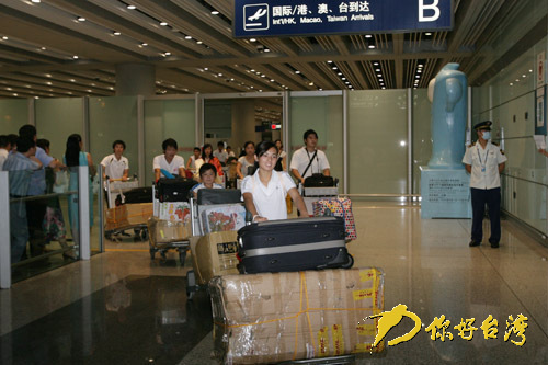吴桥县杂技团一行四十余人于昨晚23时抵达北京首都国际机场(你好台湾网 张鹏 摄)