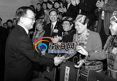 南海网3月9日消息:今天中午12时02分,海南代表团19位代表走出人民大会堂,沐浴着北京明媚的春光,激情满怀。就在5分钟前,在海南厅,他们刚刚握别温家宝总理,亲身感受了总理对海南的关爱:支持海南经济社会发展有利于全局;亲耳聆听了总理对海南的厚望:要把海南建设成为绿色之岛、开放之岛、文明之岛与和谐之岛。