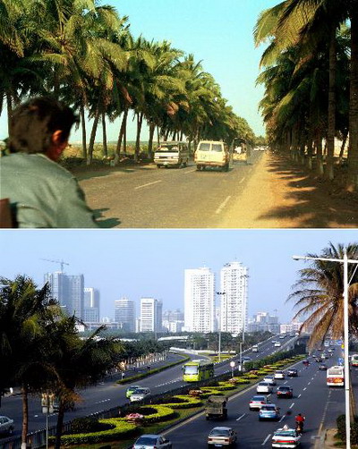 这是海口市滨海大道今昔对照图。上图:1990年1月,“滨海大道”仅仅是由海口城区通往秀英港码头的一条两车道公路。下图:现在的滨海大道已经是纵贯海口西海岸、长达20多公里、双向六车道的城市交通主干道(2008年3月12日摄)。