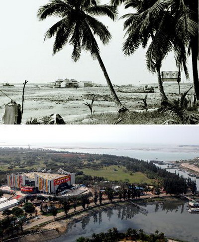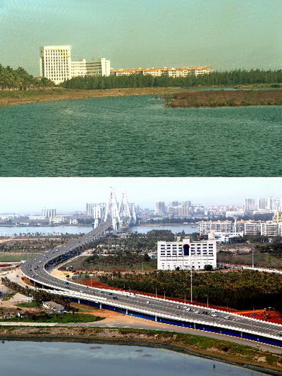 这是海口市龙昆沟出海口地区今昔对照图。上图:海口市龙昆沟出海口(1990年1月摄)。下图:龙昆沟出海口地区现在成为道路纵横、高楼林立的新市区(2008年3月19日摄)。