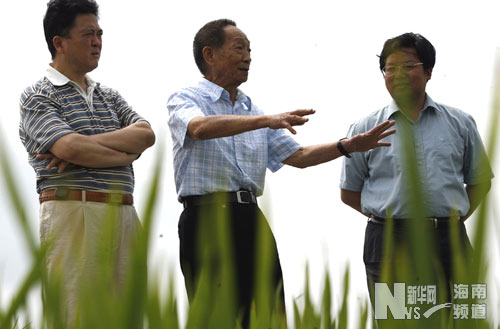 袁隆平(中)等在海南“南繁”基地察看育种水稻的生长情况