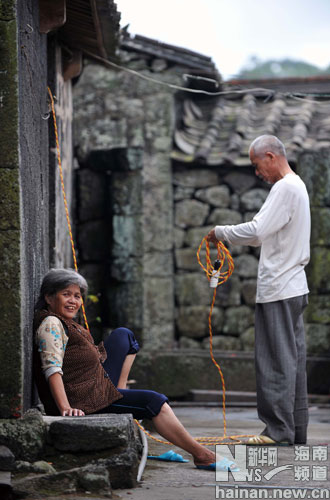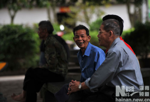 海南省海口市石山镇美社文明生态村的几位老人在村中的文化广场上聊天(1月6日摄)。