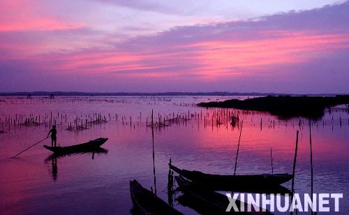 这是海南省海口市东寨港红树林国家级自然保护区内晚霞下的渔舟。