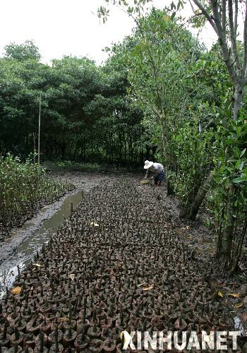 海南省海口市东寨港红树林国家级自然保护区的工作人员在培育红树林幼苗。 新华社记者丁林摄