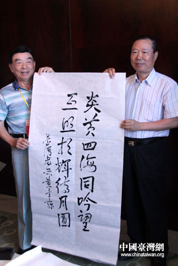来自台湾的黄幸强上将写下“炎黄四海同吟望 互照相辉待月圆”来表达两岸共同的愿景(中国台湾网 李徽 摄)