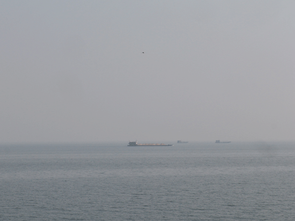 由于天气湿热,洞庭湖面上雾气连连,另有一番景致;还有水鸟在湖面上飞翔。