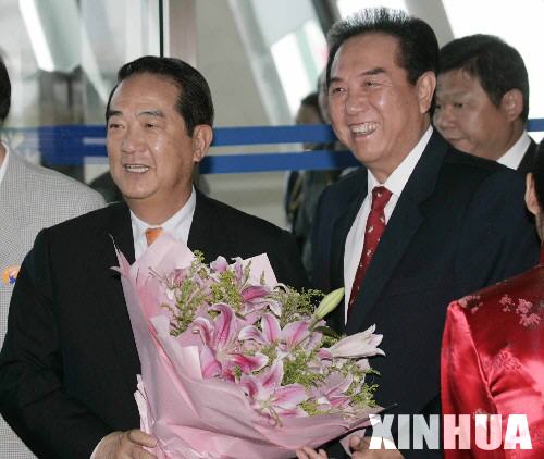这是中共中央台湾工作办公室主任陈云林(前右)在浦东机场迎接宋楚瑜。 (新华社记者 张明 摄)