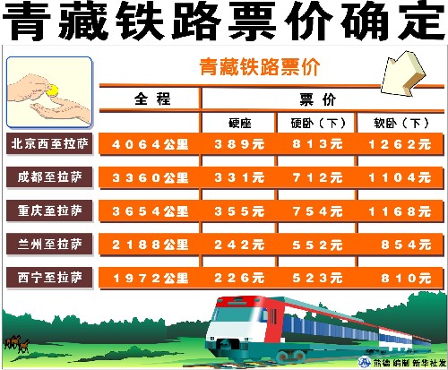 其中,北京西至拉萨全程4064公里,硬座票价389元,硬卧(下)813元,软卧(下)1262元。成都至拉萨全程3360公里,硬座票价331元,硬卧(下)712元,软卧(下)1104元。重庆至拉萨全程3654公里,硬座票价355元,硬卧(下)754元,软卧(下)1168元。兰州至拉萨全程2188公里,硬座票价242元,硬卧(下)552元,软卧(下)854元。西宁至拉萨全程1972公里,硬座票价226元,硬卧(下)523元,软卧(下)810元。