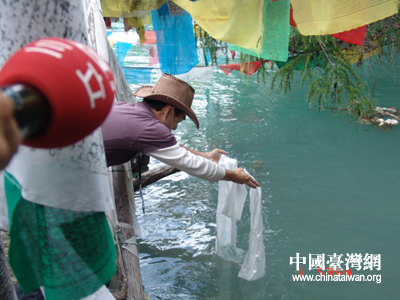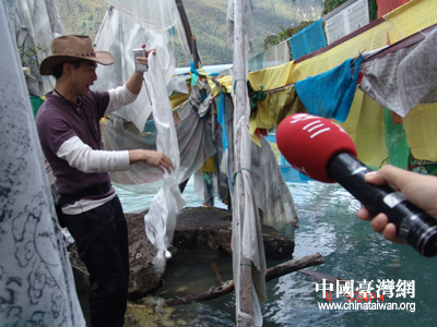中国台湾网7月6日消息 7月4日,海峡两岸记者游览了西藏素享盛名的巴松措湖。巴松措湖不仅风光美丽,而且有着许多美丽神奇的传说。台湾记者被巴松措湖的神奇景象所动,尤其是有关哈达沉底的说法,台湾记者亲自体验了一回藏族宗教文化。