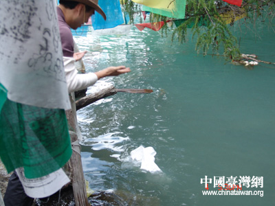 记者轻轻将哈达放进湖里