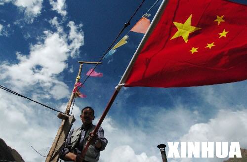 6月30日,西藏堆龙德庆县的藏族农民在挂五星红旗。当日,青藏铁路沿线的藏族群众纷纷挂起国旗,喜迎青藏铁路7月1日全线通车。(新华社记者杨俊江摄)