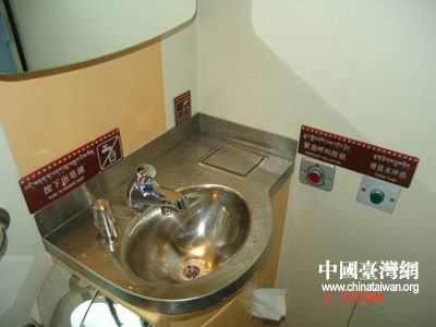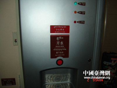列车上独特的开水饮水机,文字采用三种语言,人性化服务令人温馨