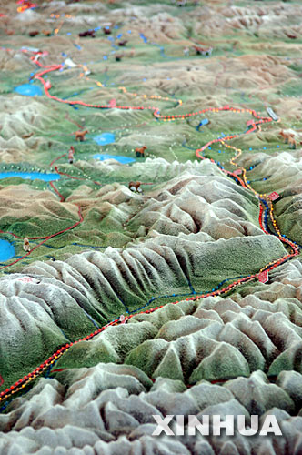 在青藏铁路沙盘上,代表高原铁路的红色线条在沙盘中曲折延伸(6月15日摄)。
